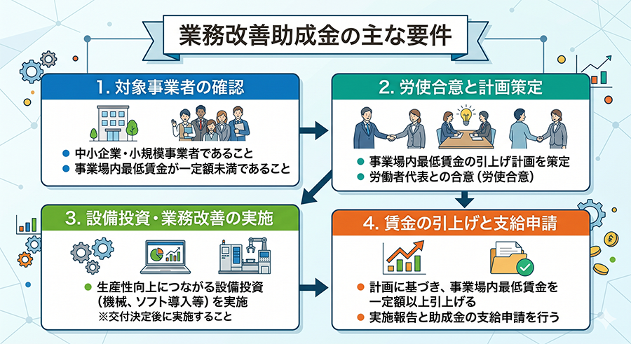 業務改善助成金を受け取るための仕組みは、非常にシンプルです。以下の2つのアクションを「セットで」行うことが条件となります。
